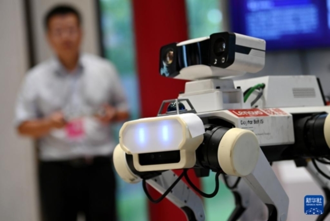 9月17日,工作人员在论坛的文化遗产数字化精品项目展上操作展示应用于应县木塔数字化保护项目的联想晨星六足机器狗。新华社记者李一博 摄