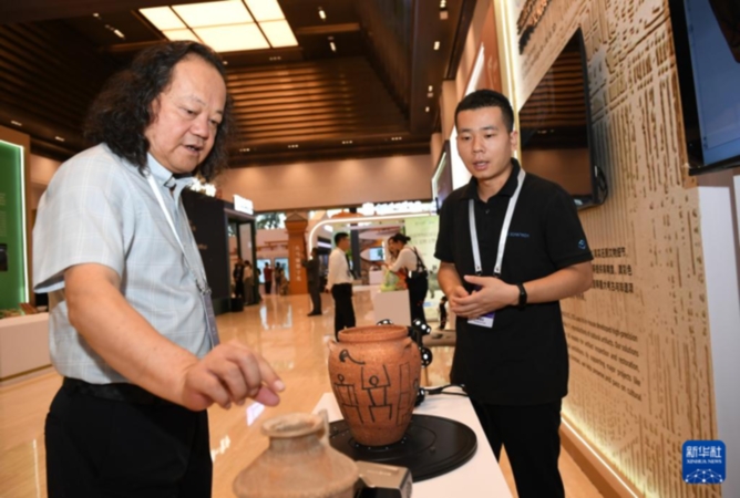 9月17日,与会嘉宾在论坛的文化遗产数字化精品项目展上了解AI智慧应县木塔数字化保护项目。新华社记者 李一博 摄