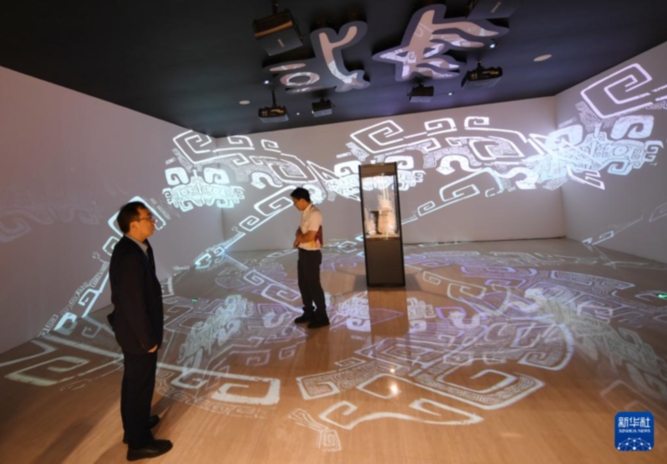 9月17日,与会嘉宾在论坛的文化遗产数字化精品项目展上参观宝鸡青铜器博物院《宅兹中国数字化展》。新华社记者 李一博摄