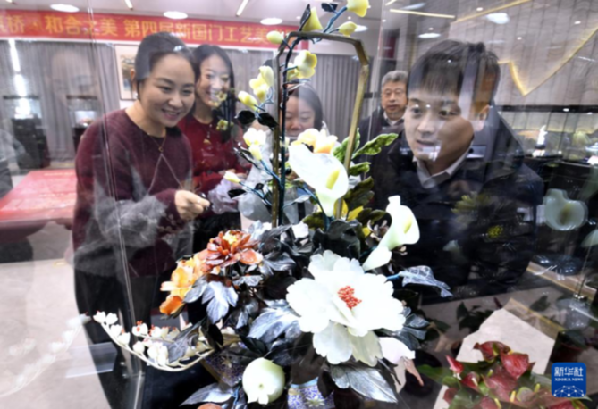 观众在参观玉雕大师张铁成的作品(12月19日摄)。